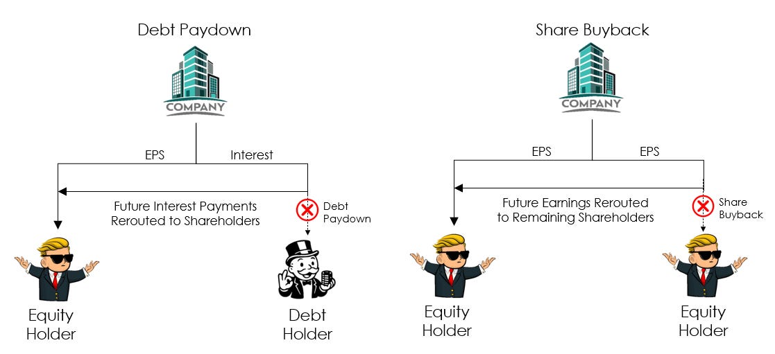 Consider a company that has $500 million in debt at 1% interest - $5 million per year in interest payments going to debt holders. Now let’s say that the company decides to retire that debt when it reaches maturity.