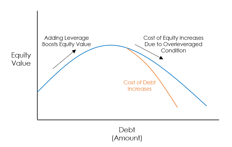 What we see is that the first dollar of debt improves the value of equity, but we eventually reach a point where the rising risks to equity overtake the provided benefits of leverage. Beyond that point, the marginal dollar of debt actually begins to hurt equity values.